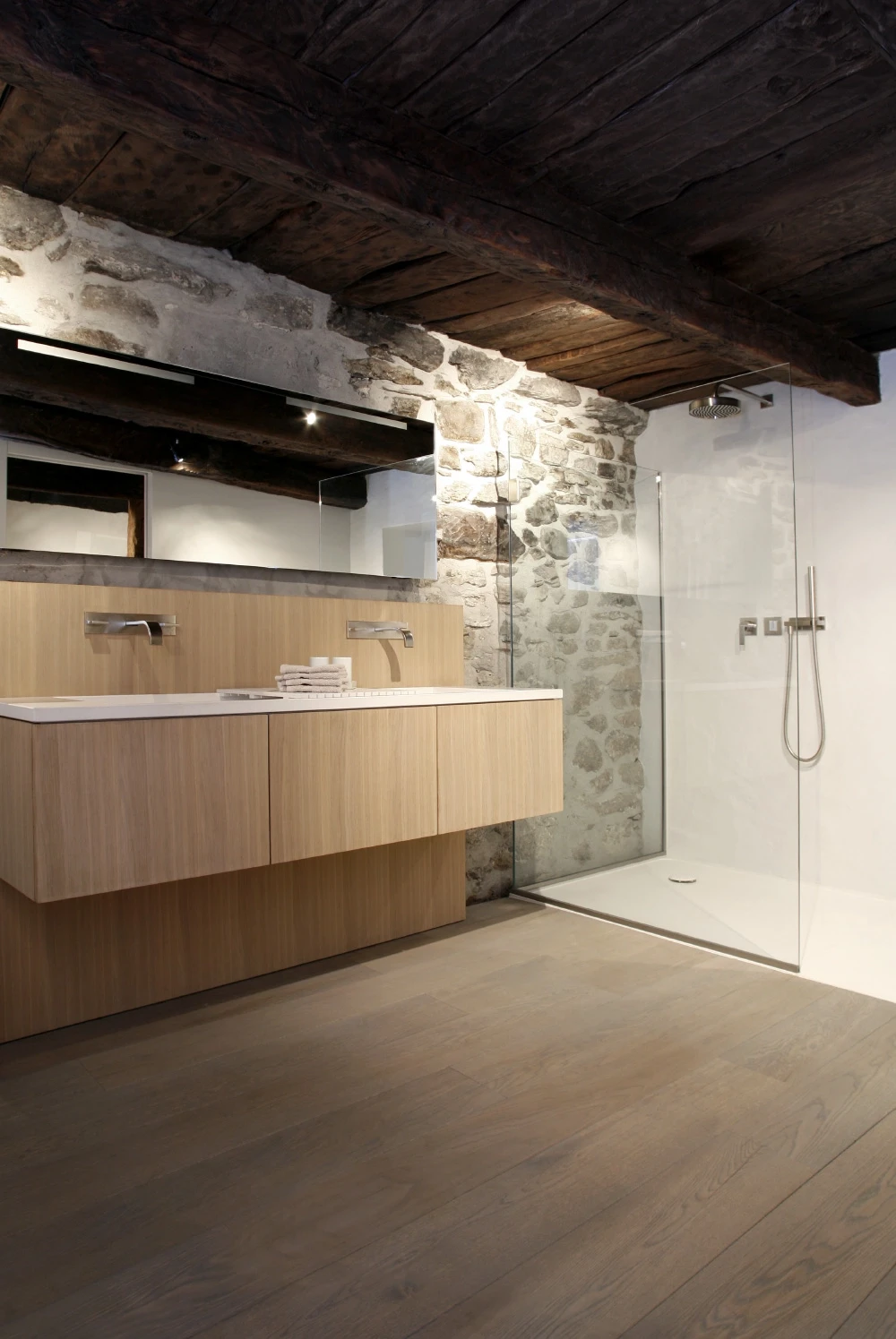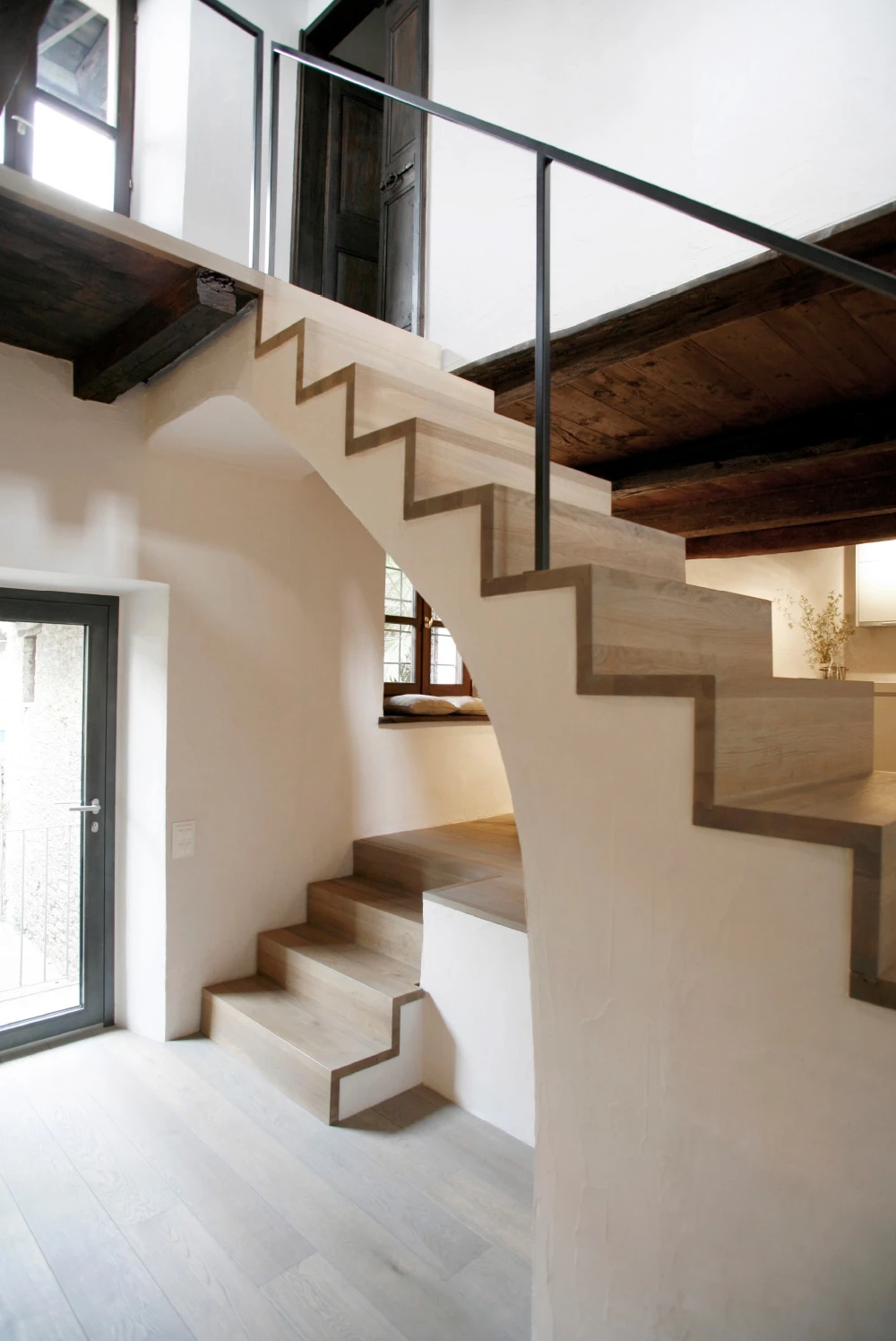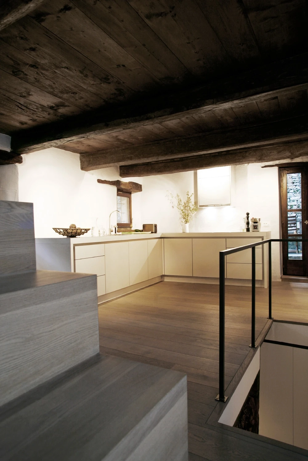 Ein 250-jähriges Steinhaus im alten Dorfkern von Brione wurde 2007 neu strukturiert. Die Innenarchitektur respektiert die massive Bausubstanz und bringt sie mit minimalistischen Einbauten in Balance. Akazienholzdecken, rohe Steinmauern und ruhige Farben prägen das Bild. So entsteht ein Interior, das den rustikalen Charme bewahrt – und gleichzeitig modern auftritt. Form- und Materialkonzept Badgestaltung Küchengestaltung Möblierung