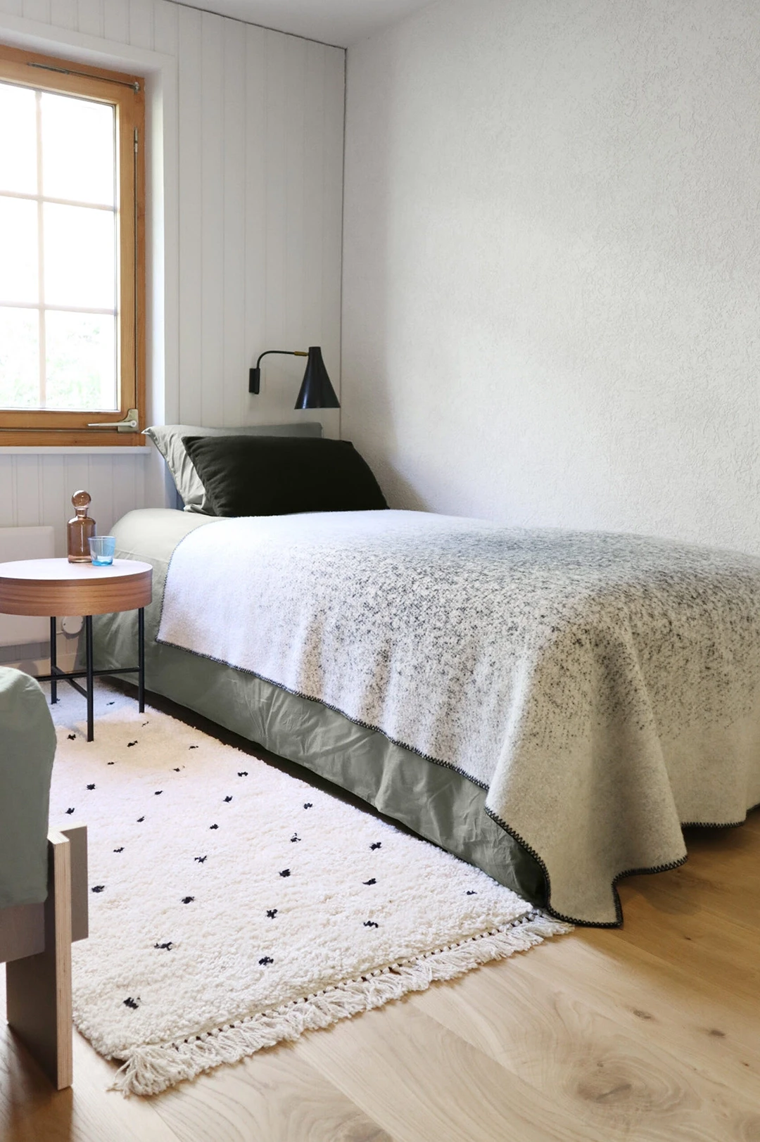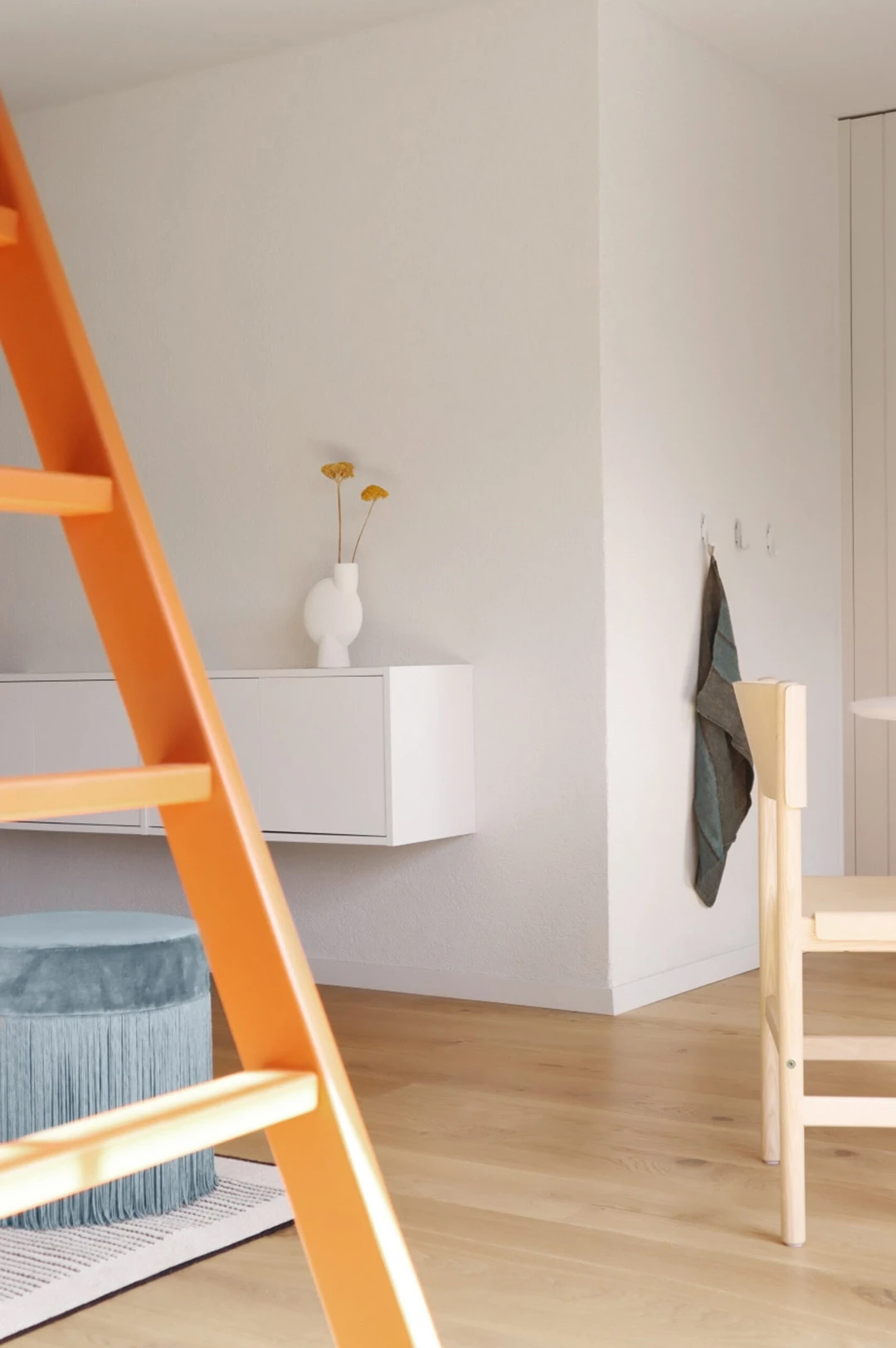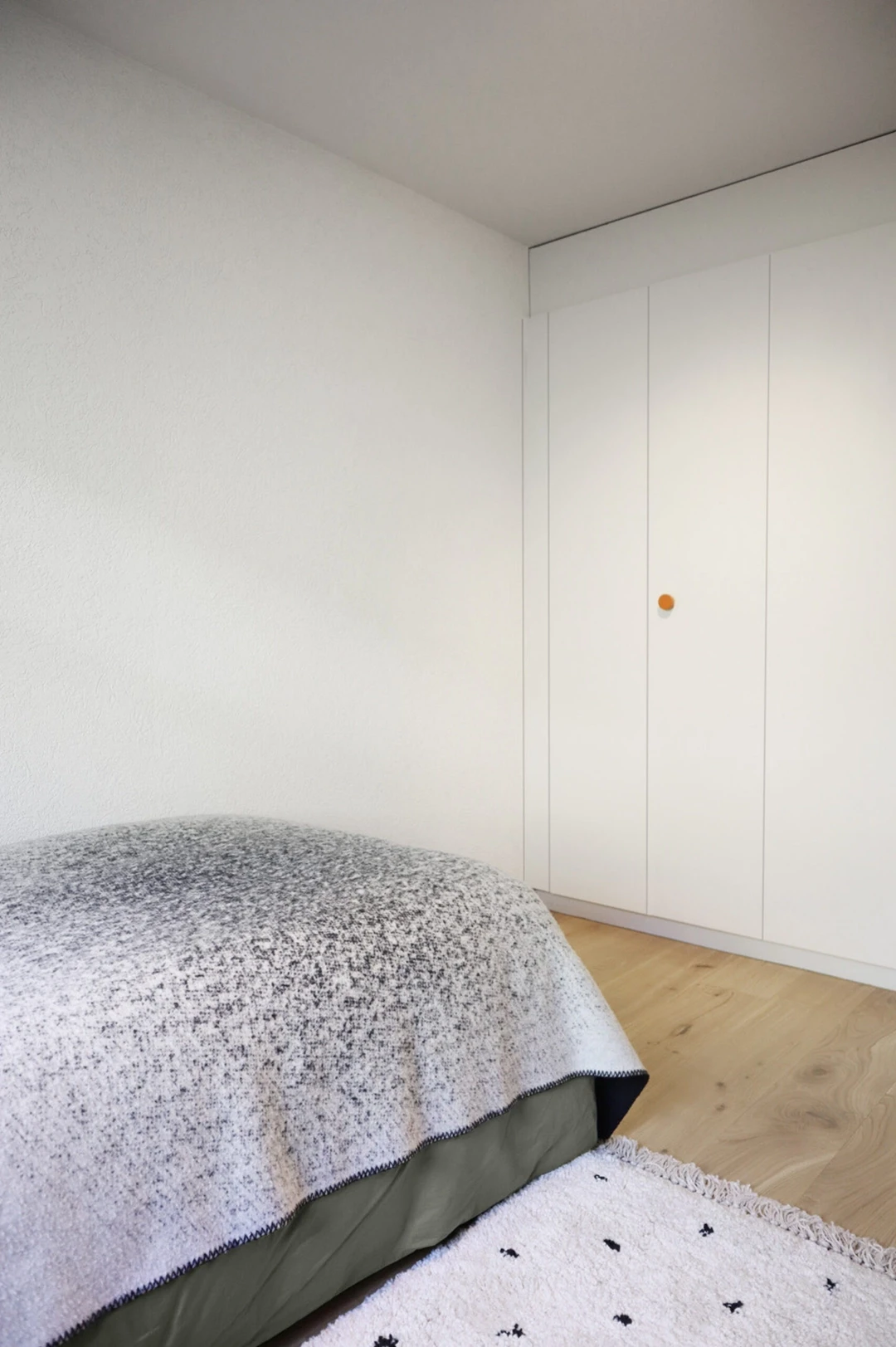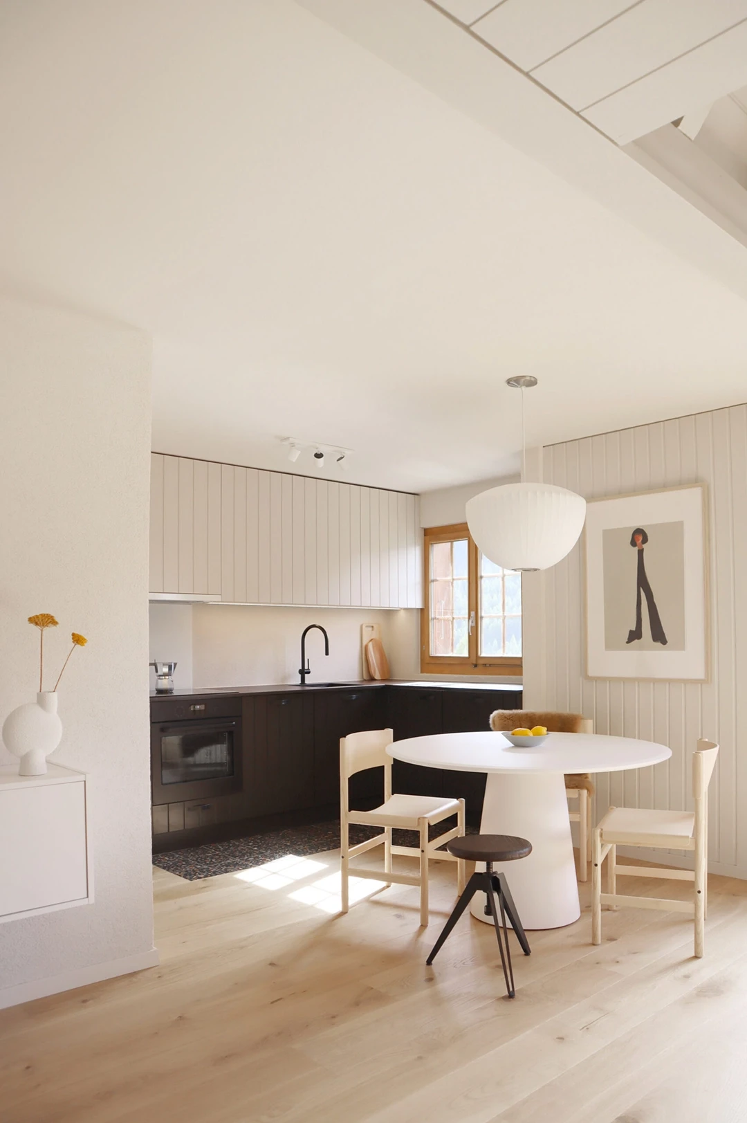 Die sanierte Wohnung im Walliser Chalet übernimmt und interpretiert die lineare Struktur der originalen Wandvertäfelung neu. Helle Lasuren verleihen der Holzoberfläche Leichtigkeit. Die Möblierung verbindet alpine Elemente mit Scandinavian Modern – reduziert, aber warm. So entsteht ein Ferienort mit hoher räumlicher Qualität und respektvoller Weiterentwicklung der Bausubstanz von 1970. Farbe und Material Küche Bad Möblierung