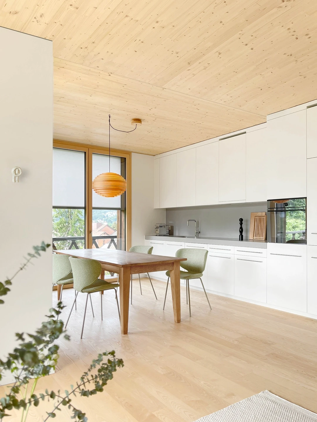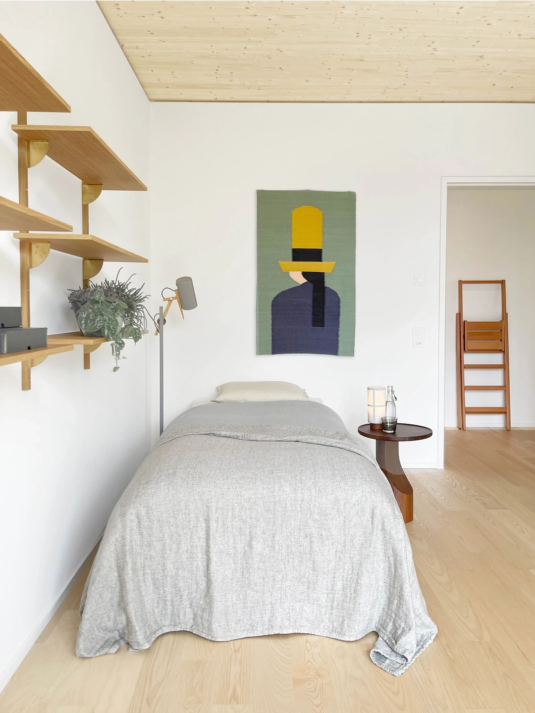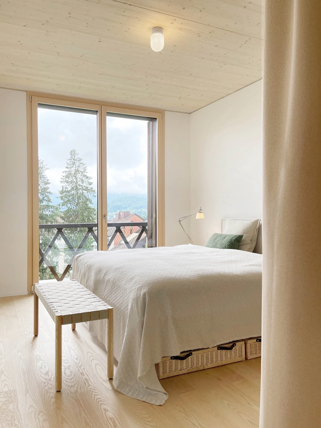 Im Garten des historischen Luzerner Klosters wurde 2023 ein Mehrfamilienhaus mit 30 Wohneinheiten realisiert. Die Holzfassade nimmt Bezug auf den Ort – wie eine übergrosse Gartenlaube. Diese architektonische Haltung wurde in der Attika-Wohnung im Innern fortgeführt. Eine Kombination aus verschiedenen Hölzern, natürlichen Farbtönen und textilen Strukturen schafft einen stimmigen, zurückhaltenden Innenausbau mit ruhiger, wohnlicher Präsenz. Stellplan Moodboards Möblierung Staging