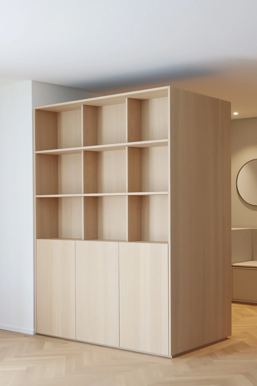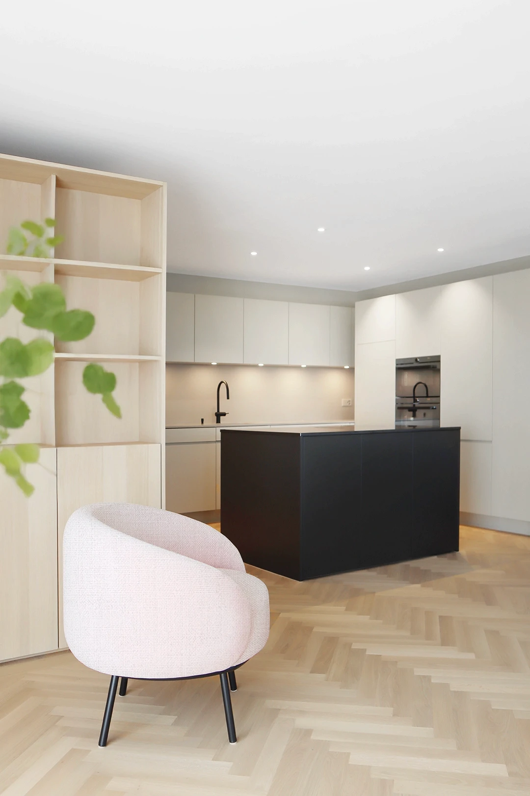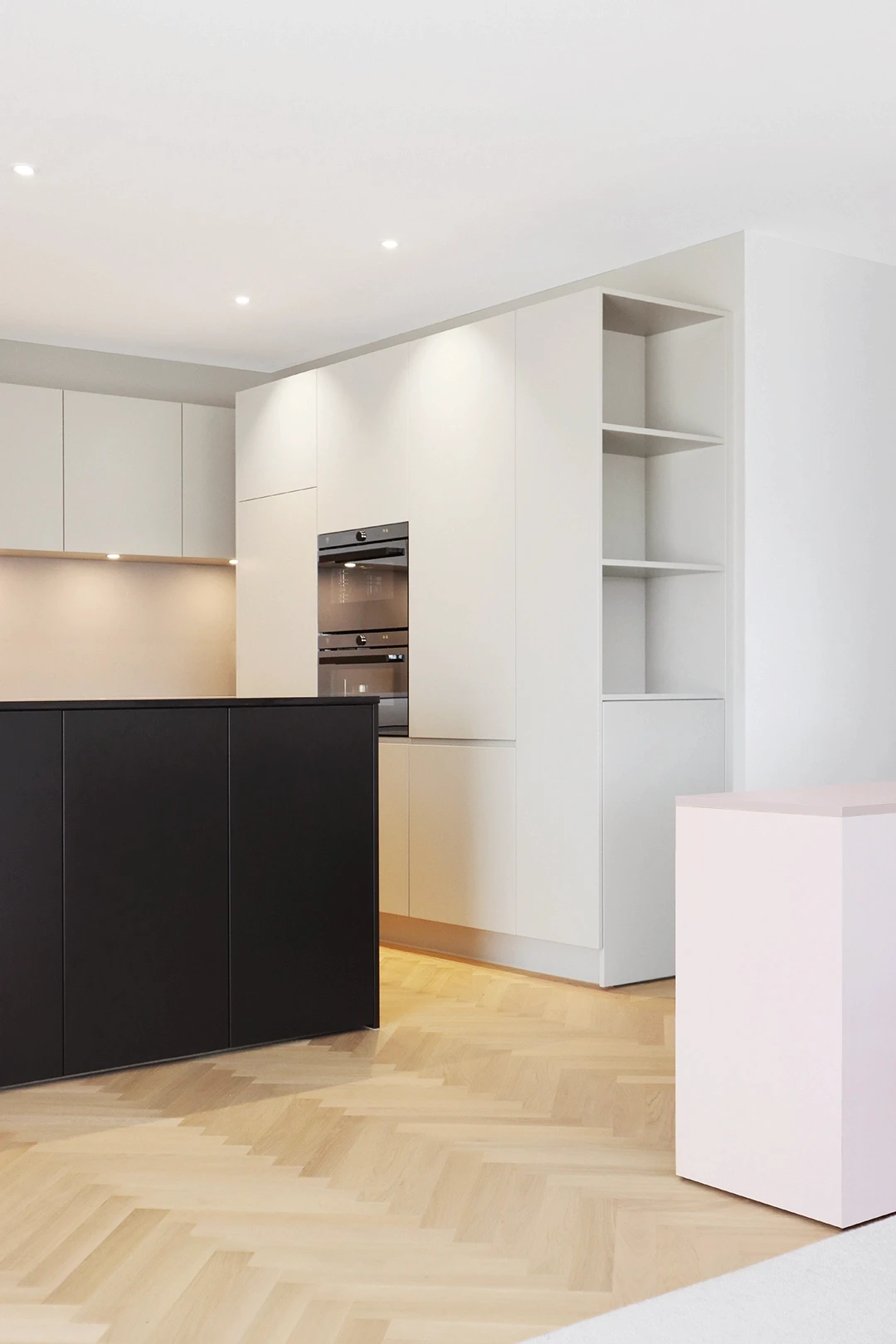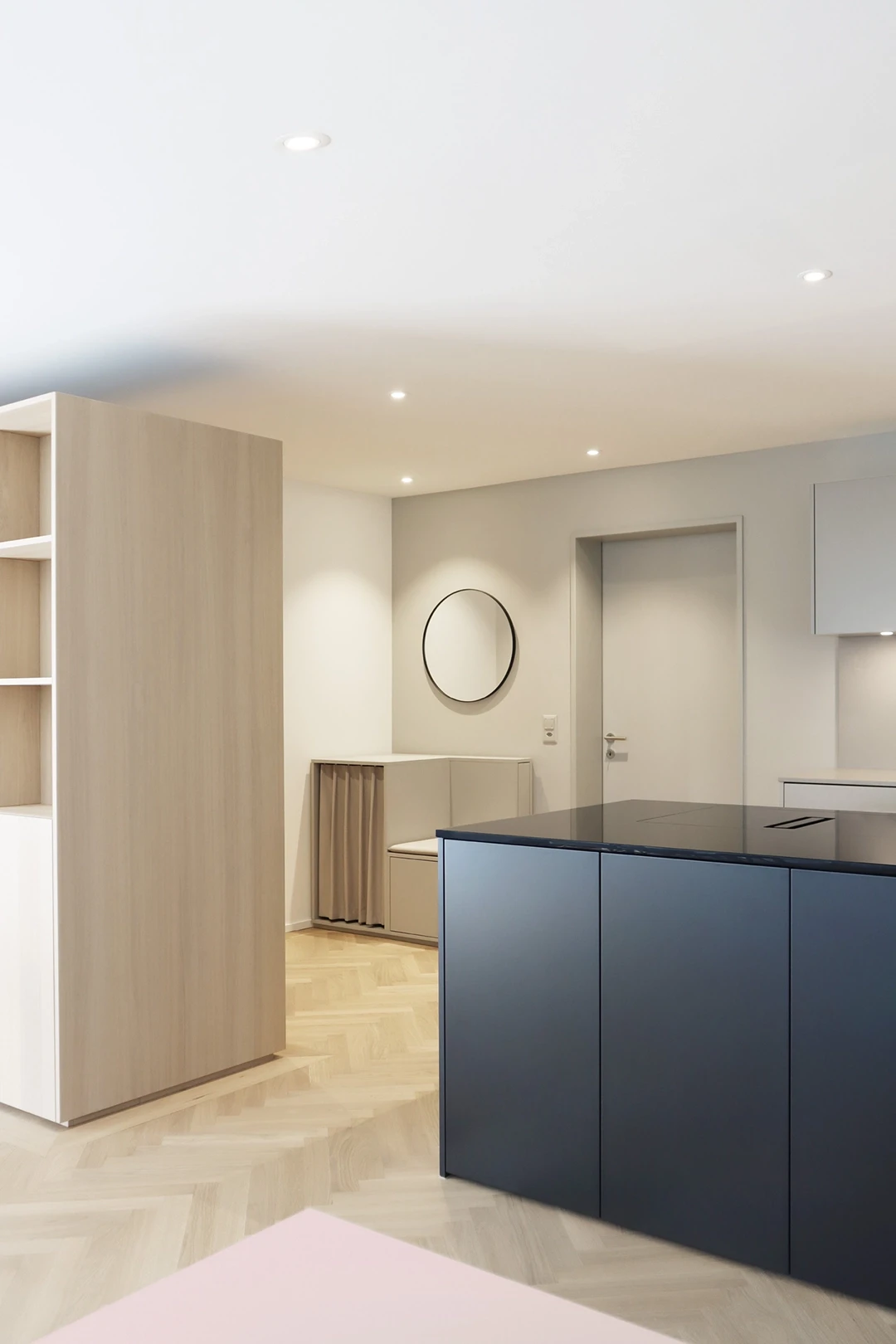 In einer der drei grosszügigen Terrassenwohnungen in Neftenbach wurde ein Interior entwickelt, das Geometrie, Materialität und Licht in Balance bringt. Helle Grautöne treffen auf schwarze Akzente und warme Eiche, die als Möbelkuben über dem Fischgratparkett schweben. Das Resultat ist ein klar gegliedertes Raumkonzept mit Eleganz und Zeitlosigkeit. Farbe und Material Küchendesign Badgestaltung Einbaumöbel