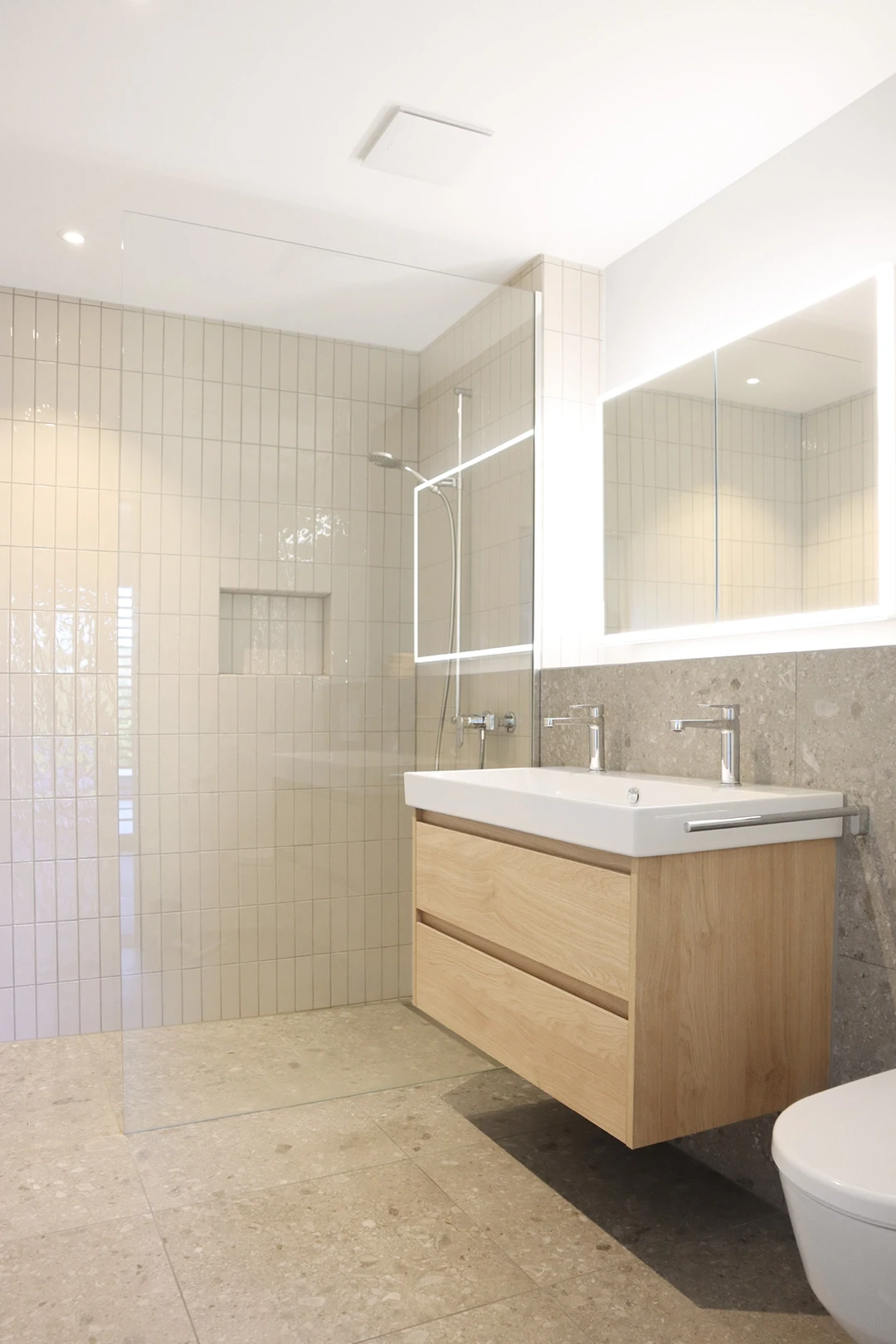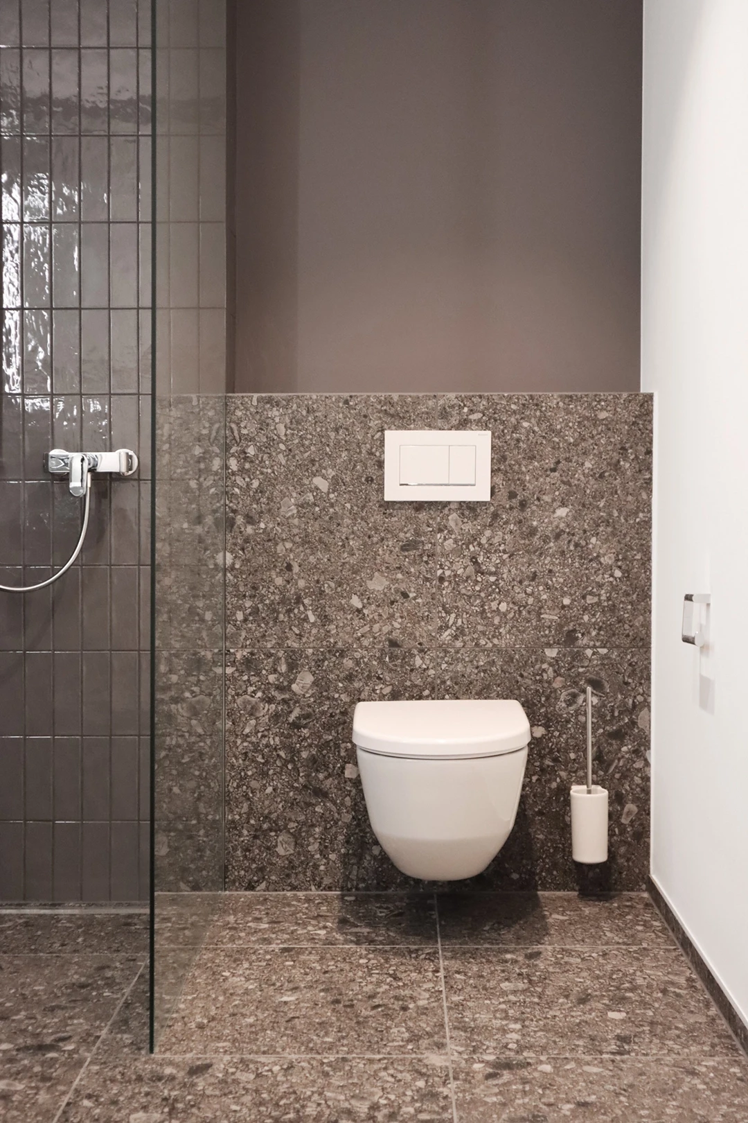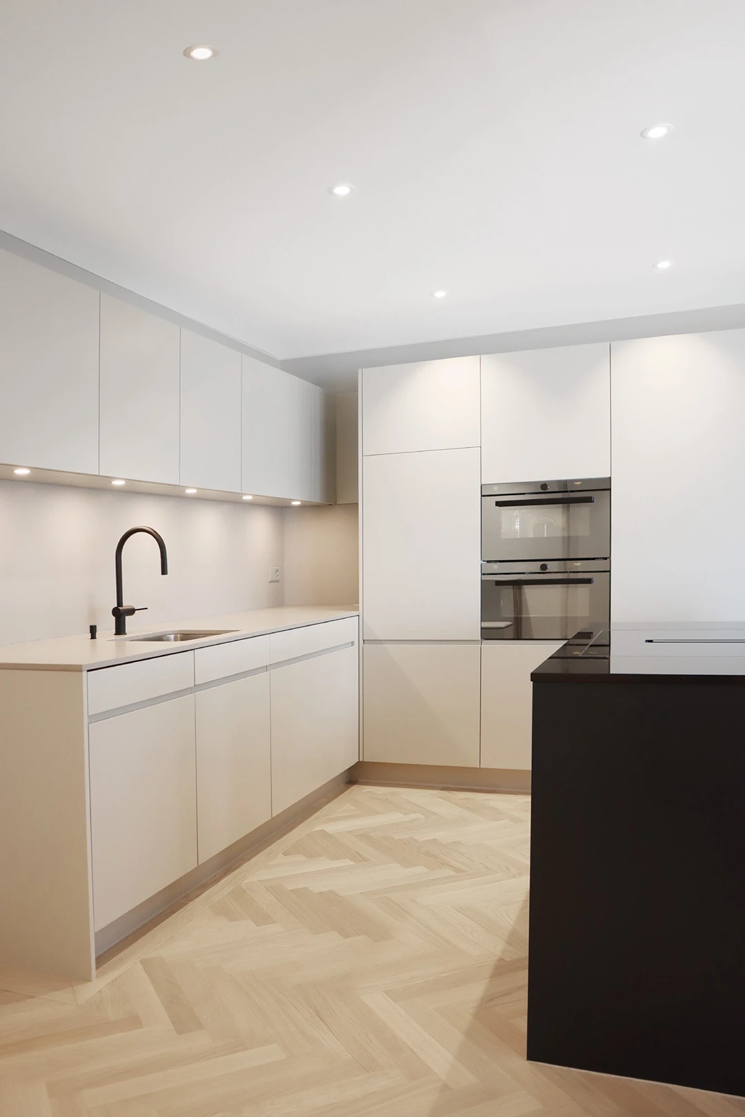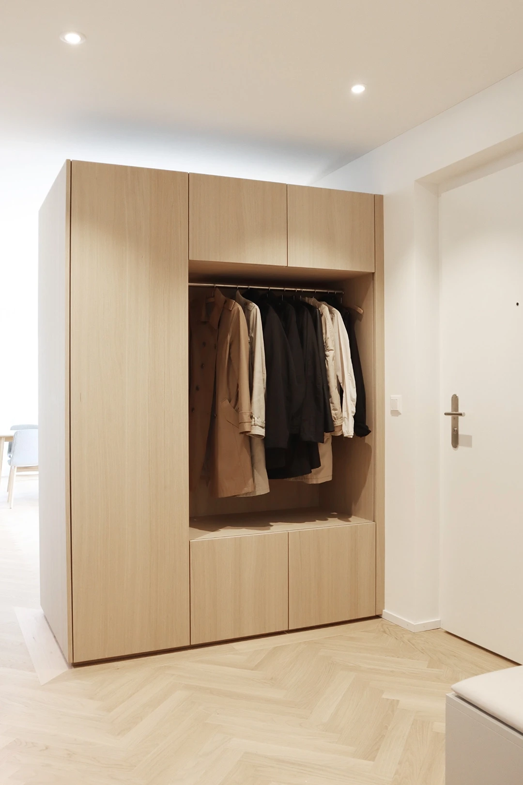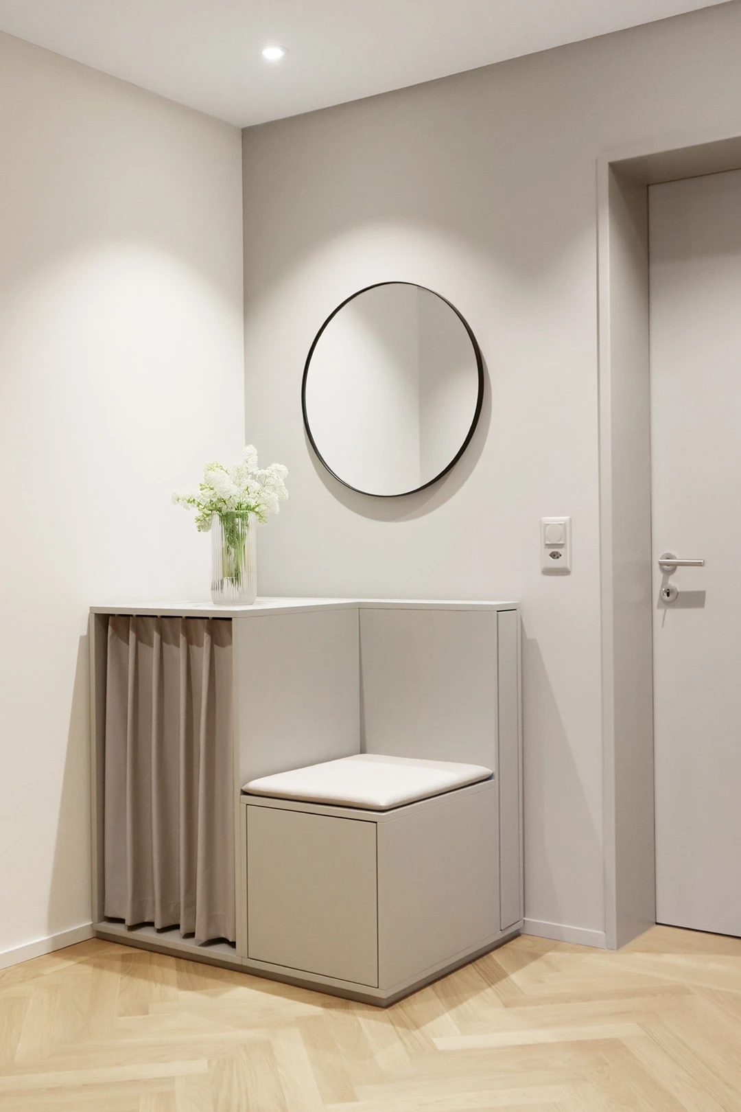 In einer der drei grosszügigen Terrassenwohnungen in Neftenbach wurde ein Interior entwickelt, das Geometrie, Materialität und Licht in Balance bringt. Helle Grautöne treffen auf schwarze Akzente und warme Eiche, die als Möbelkuben über dem Fischgratparkett schweben. Das Resultat ist ein klar gegliedertes Raumkonzept mit Eleganz und Zeitlosigkeit. Farbe und Material Küchendesign Badgestaltung Einbaumöbel