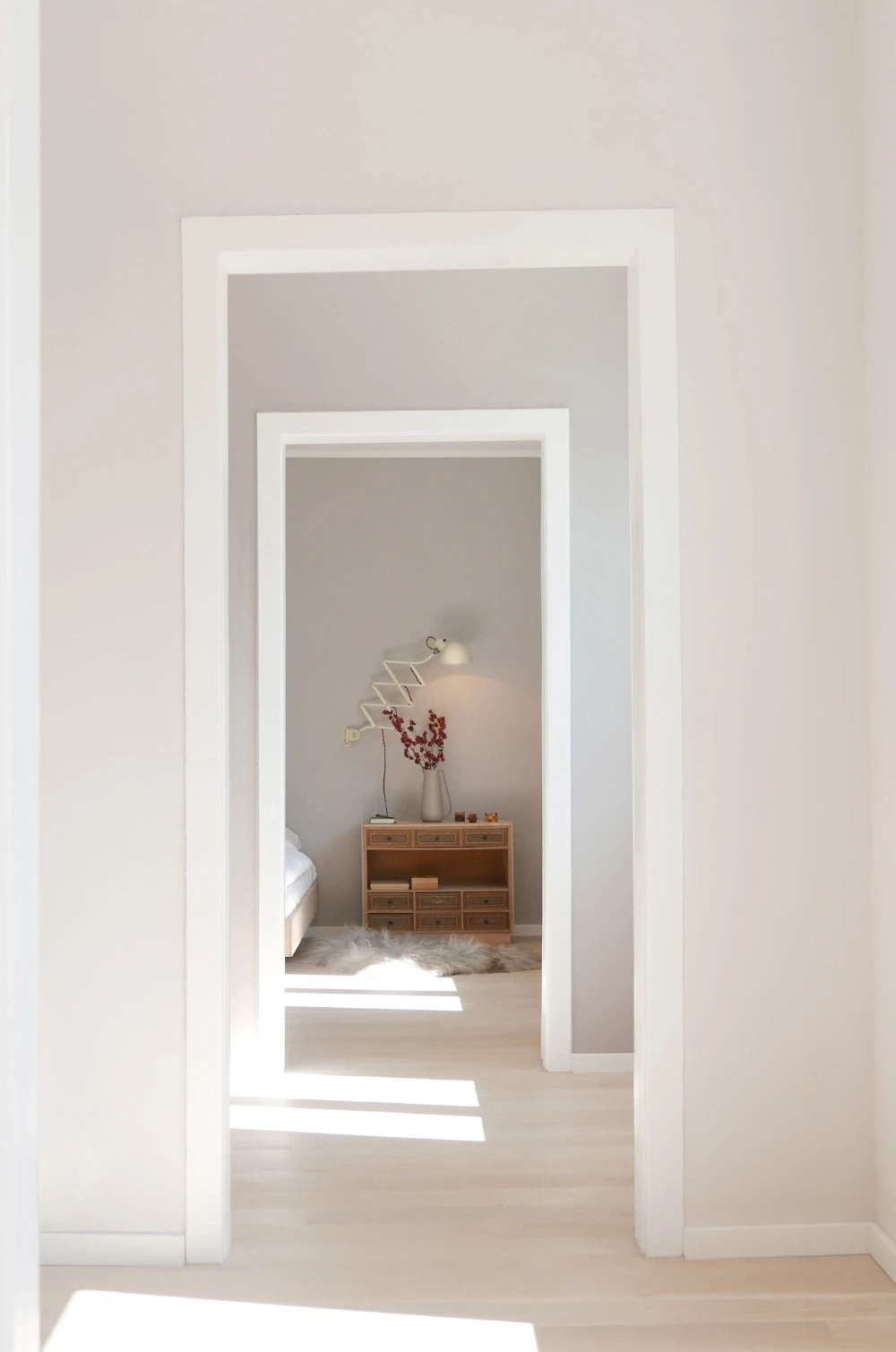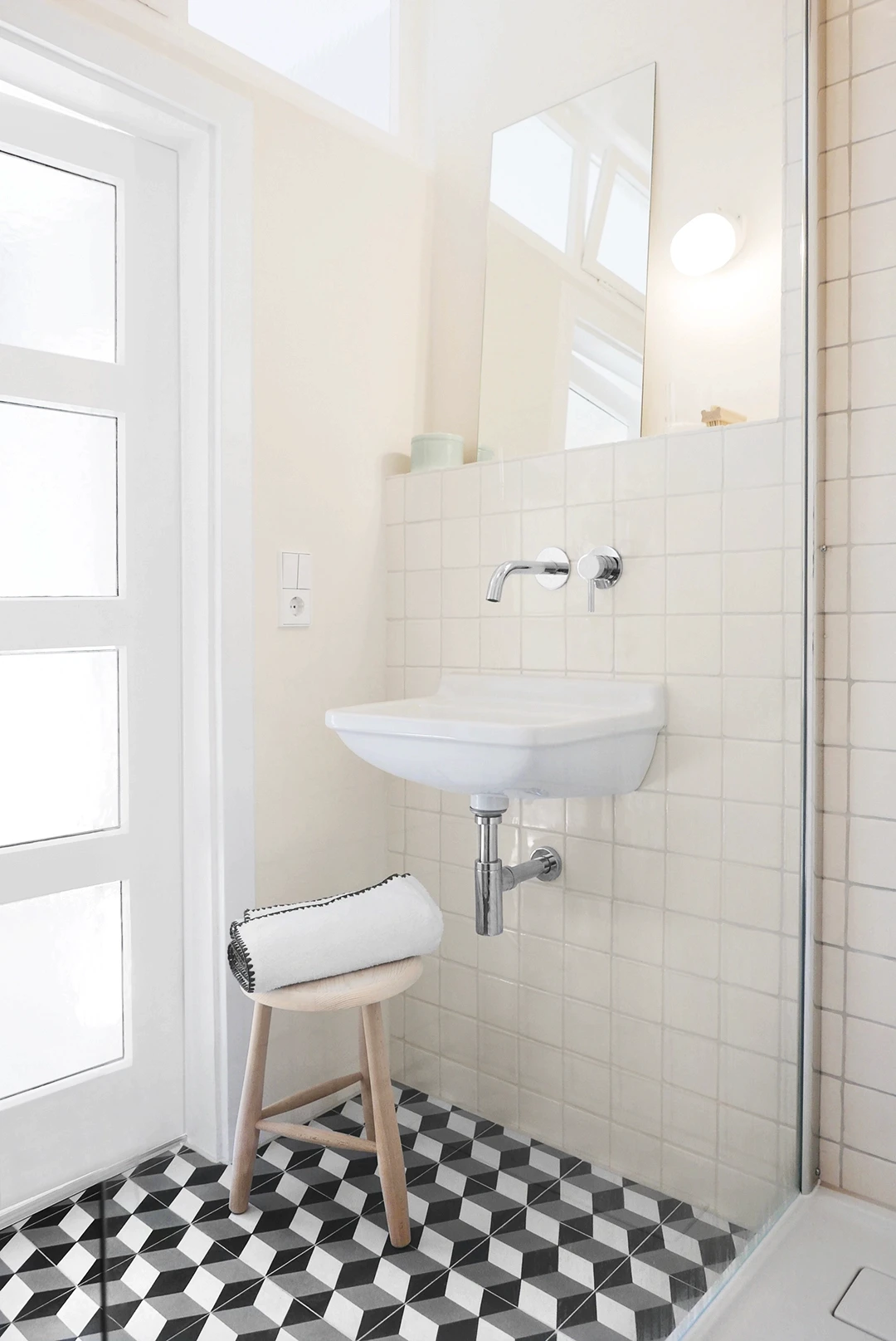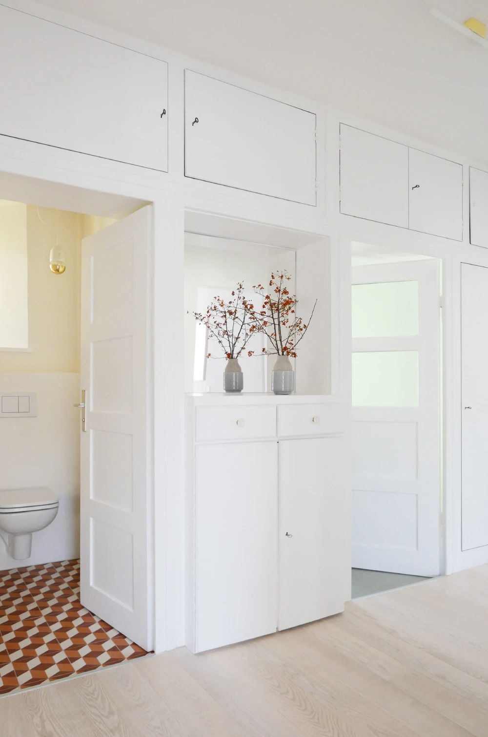 Die Wohnung in einem denkmalgeschützten Bau aus den 1930er-Jahren wurde 2014 zurückhaltend renoviert. Der Grundriss blieb erhalten, die Materialien folgen der damaligen Formensprache. Das Interior Design bezieht sich auf den Bauhausstil, bricht ihn jedoch farblich in die Gegenwart. So entsteht ein zeitgenössisches Wohnbild in einem geschichtsträchtigen Kontext. Farbe & Material Bad & Küche Möblierung Staging