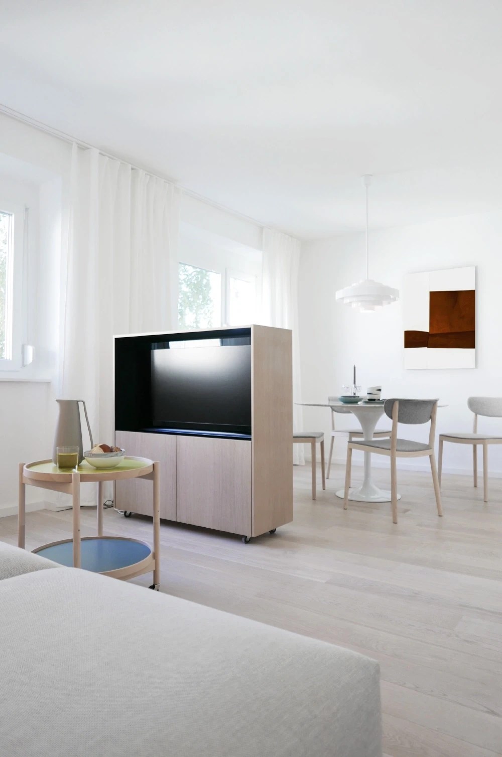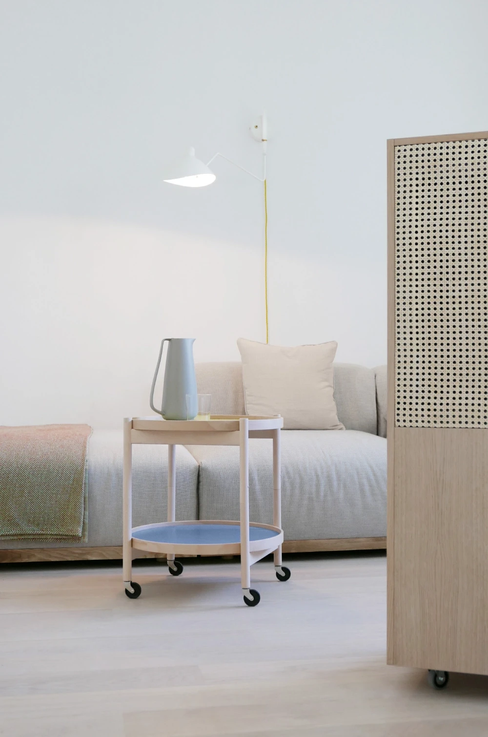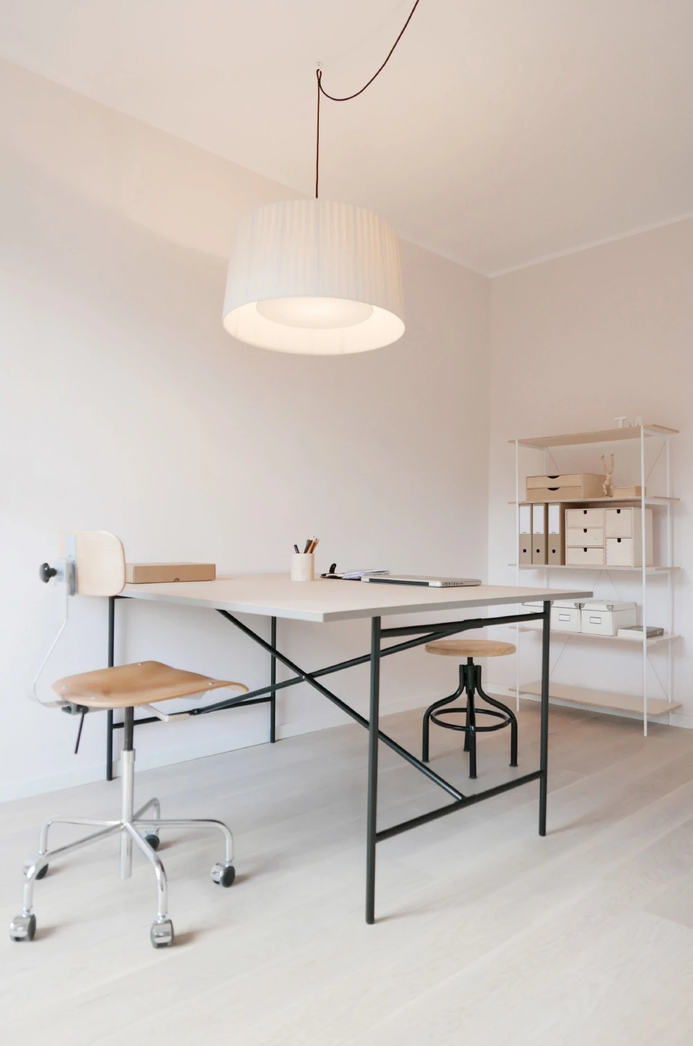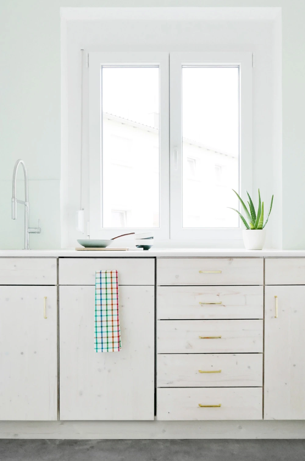 Die Wohnung in einem denkmalgeschützten Bau aus den 1930er-Jahren wurde 2014 zurückhaltend renoviert. Der Grundriss blieb erhalten, die Materialien folgen der damaligen Formensprache. Das Interior Design bezieht sich auf den Bauhausstil, bricht ihn jedoch farblich in die Gegenwart. So entsteht ein zeitgenössisches Wohnbild in einem geschichtsträchtigen Kontext. Farbe & Material Bad & Küche Möblierung Staging