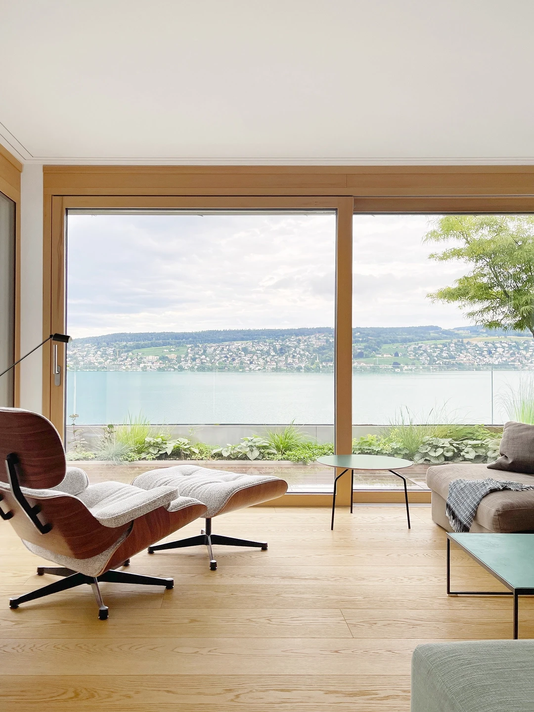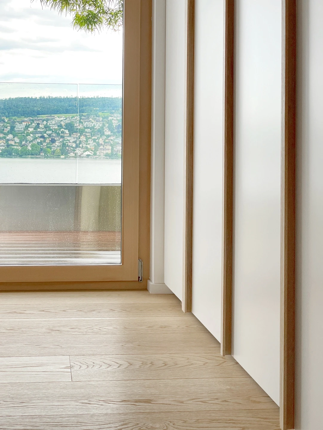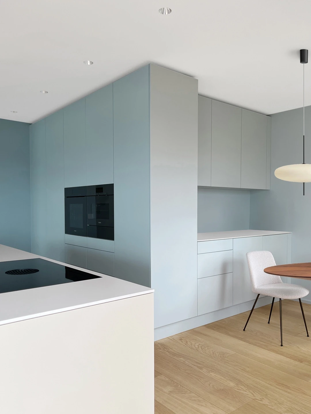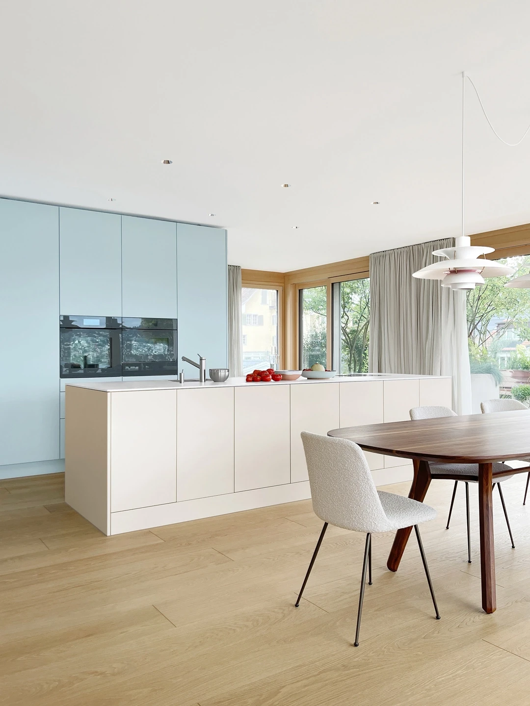 Zwei Mehrfamilienhäuser mit Seesicht prägen das Ensemble in Thalwil. Die Attikawohnung nutzt das natürliche Licht als gestalterisches Element: unterschiedliche Einfallswinkel erzeugen ein Spiel aus Helligkeit und Schatten. In der Küche gehen drei Blautöne ineinander über – inspiriert vom Zürichsee. Das Bad nimmt mit Beige- und Rosanuancen die Töne der Abendsonne auf. Ein Interior, das mit Licht erzählt. Grundriss Farbe & Material Küche Bad-Design