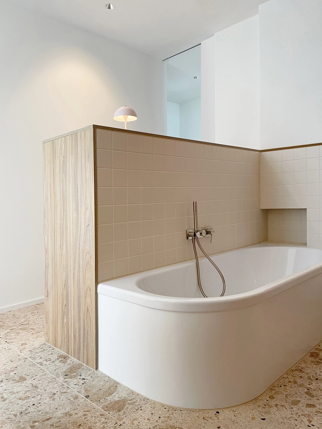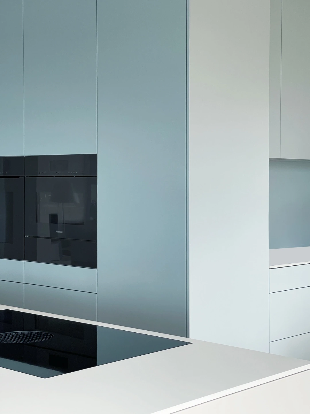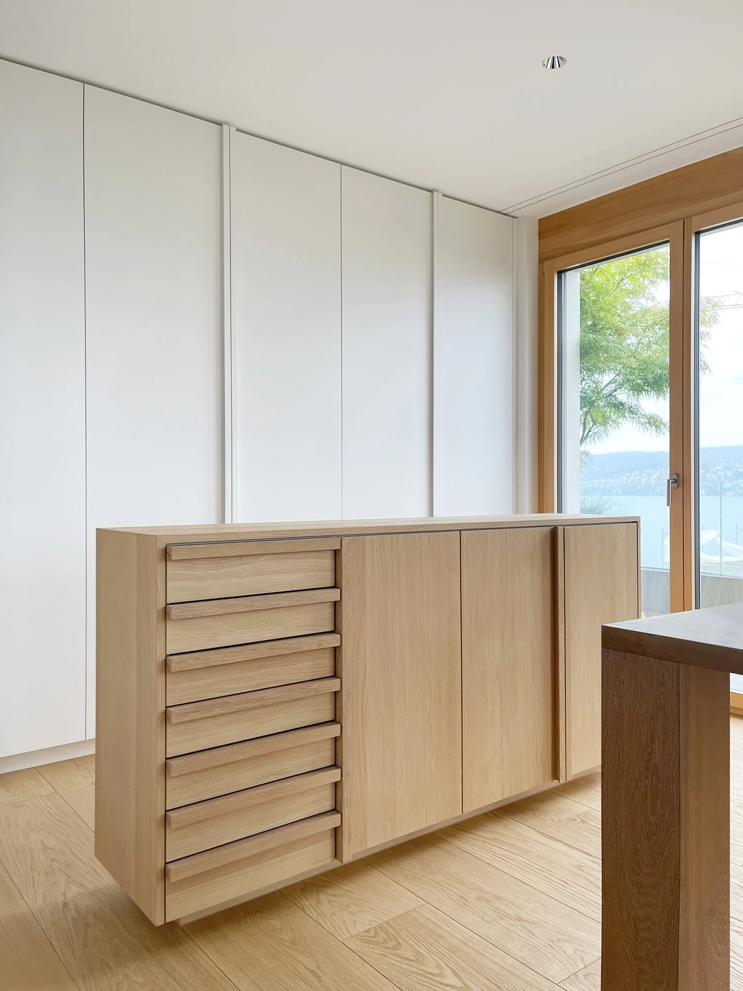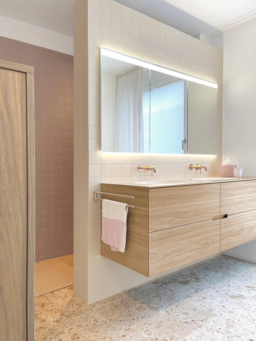 Zwei Mehrfamilienhäuser mit Seesicht prägen das Ensemble in Thalwil. Die Attikawohnung nutzt das natürliche Licht als gestalterisches Element: unterschiedliche Einfallswinkel erzeugen ein Spiel aus Helligkeit und Schatten. In der Küche gehen drei Blautöne ineinander über – inspiriert vom Zürichsee. Das Bad nimmt mit Beige- und Rosanuancen die Töne der Abendsonne auf. Ein Interior, das mit Licht erzählt. Grundriss Farbe & Material Küche Bad-Design