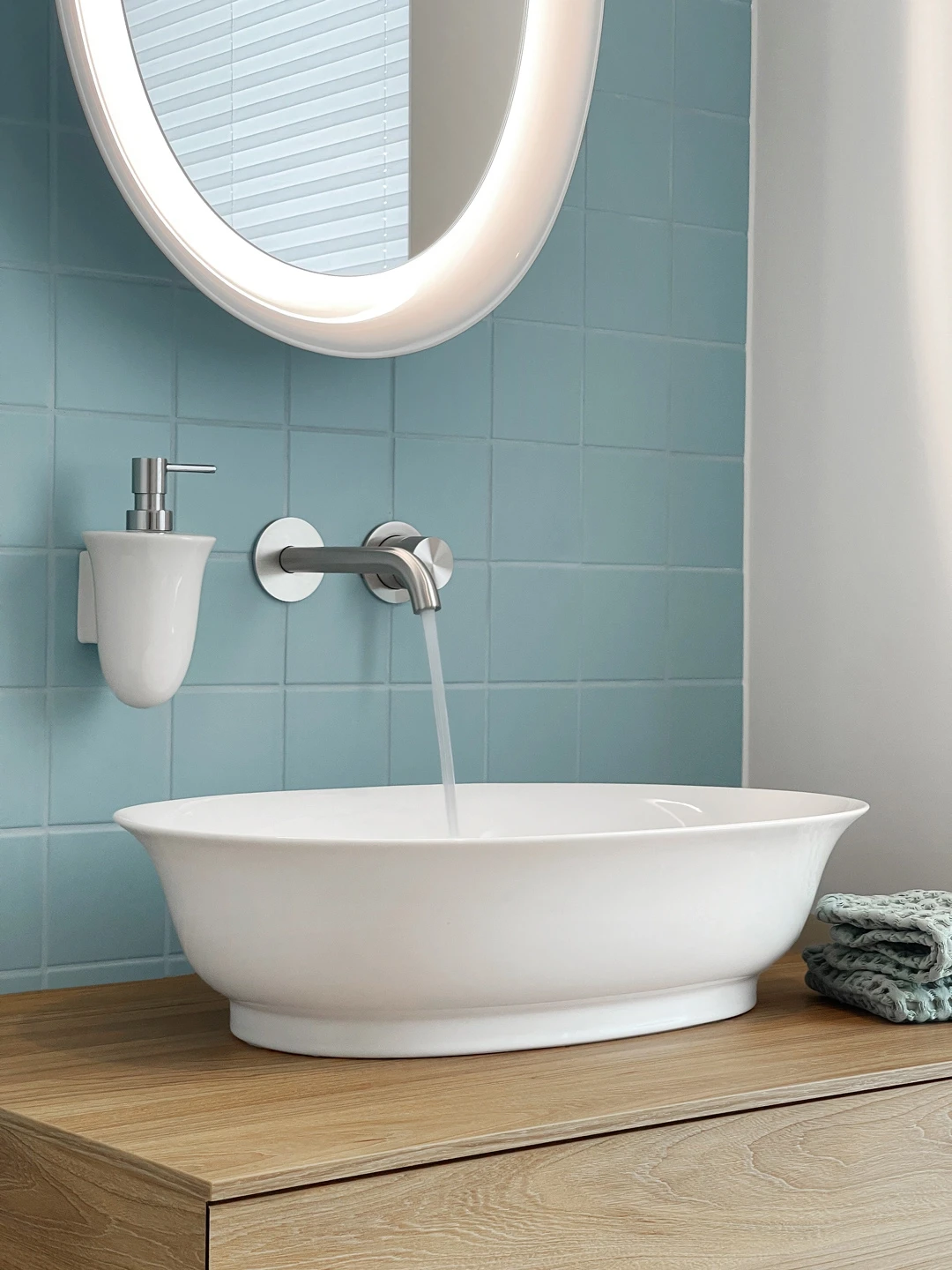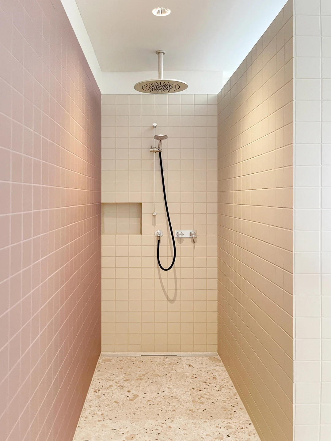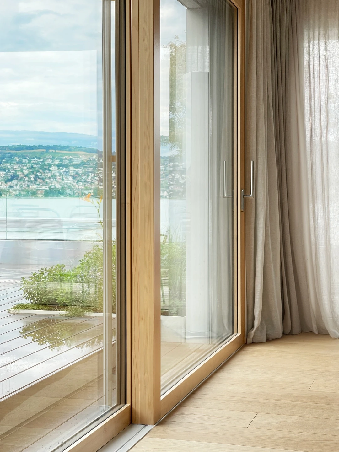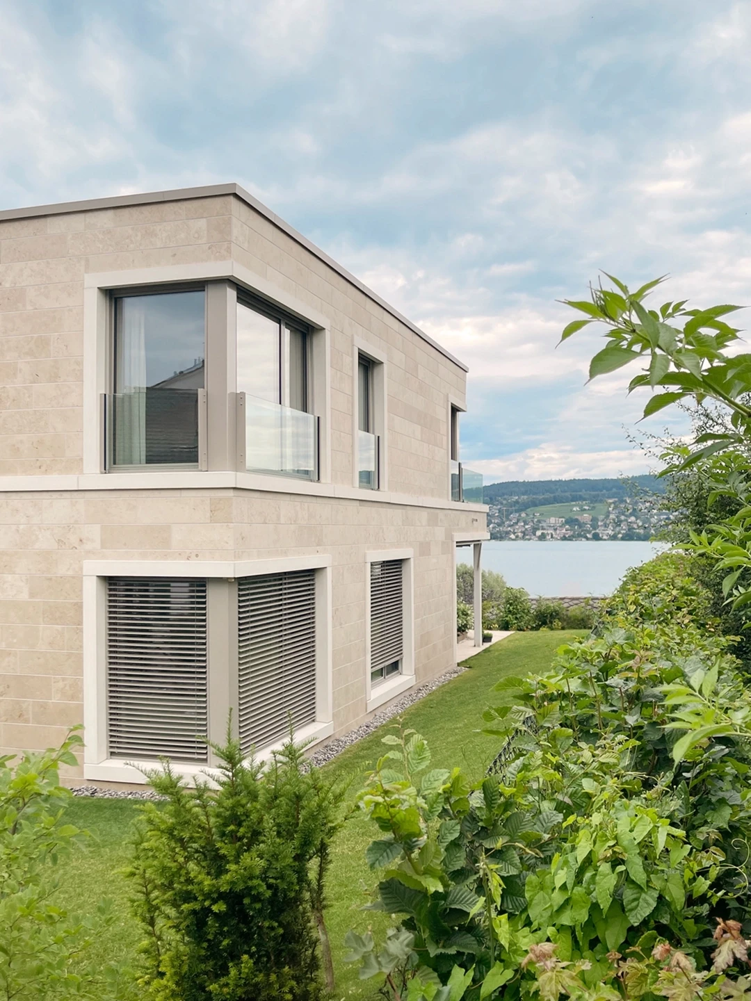 Zwei Mehrfamilienhäuser mit Seesicht prägen das Ensemble in Thalwil. Die Attikawohnung nutzt das natürliche Licht als gestalterisches Element: unterschiedliche Einfallswinkel erzeugen ein Spiel aus Helligkeit und Schatten. In der Küche gehen drei Blautöne ineinander über – inspiriert vom Zürichsee. Das Bad nimmt mit Beige- und Rosanuancen die Töne der Abendsonne auf. Ein Interior, das mit Licht erzählt. Grundriss Farbe & Material Küche Bad-Design