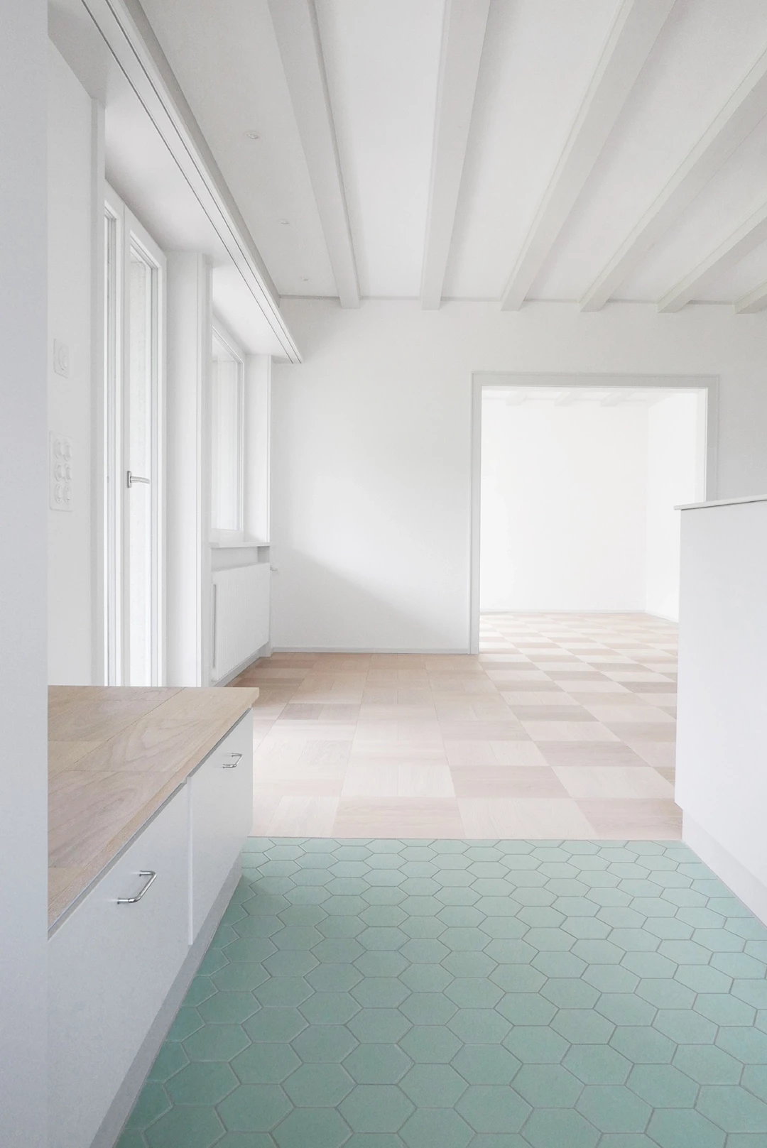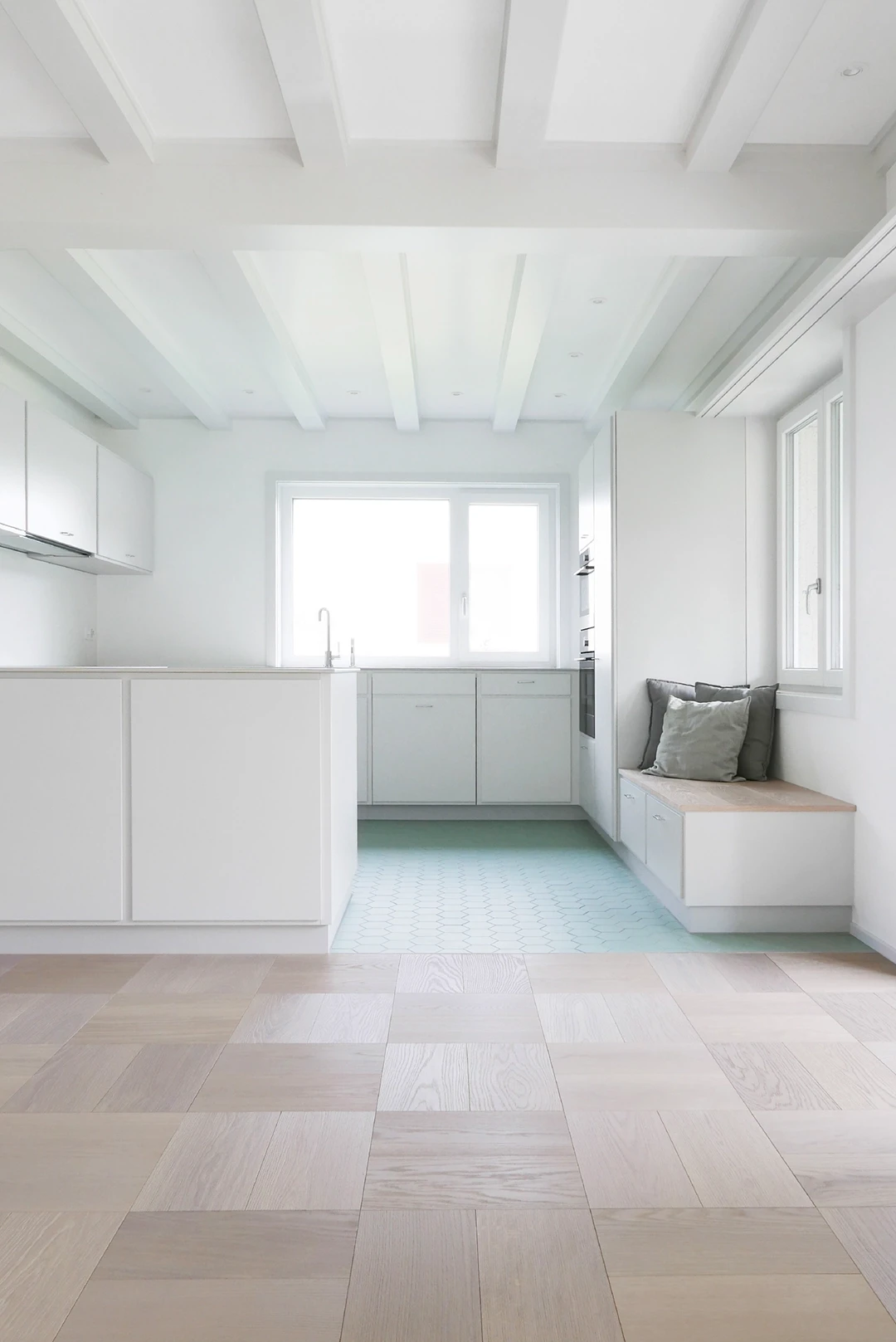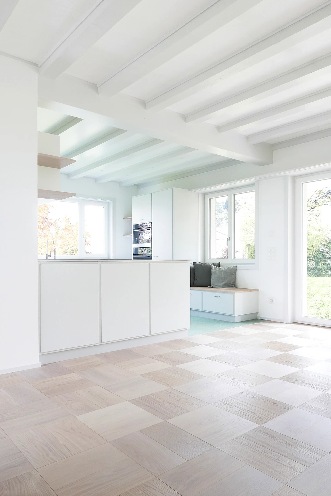 Ein Haus aus den späten 1960er-Jahren wurde innen und aussen erneuert – mit Respekt vor dem ursprünglichen Charakter. In Zusammenarbeit mit Scherrer Architekten entstand 2020 ein Innenausbau, der fein auf die Materialwelt der 60er anspielt: Würfelparkett, Bügelgriffe, Klinker. Helle Grautöne und klare Strukturen bringen Zeitlosigkeit in die Räume und lassen Vergangenheit auf Gegenwart treffen. Badgestaltung Küchengestaltung Designberatung